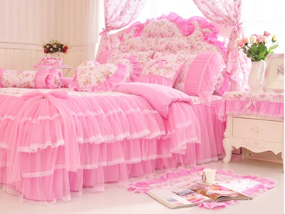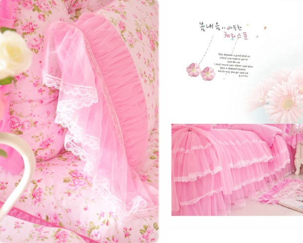 Pink Lace Princess Cotton Bedding Set King Queen 4pcs Duvet Cover Bed Skirts New