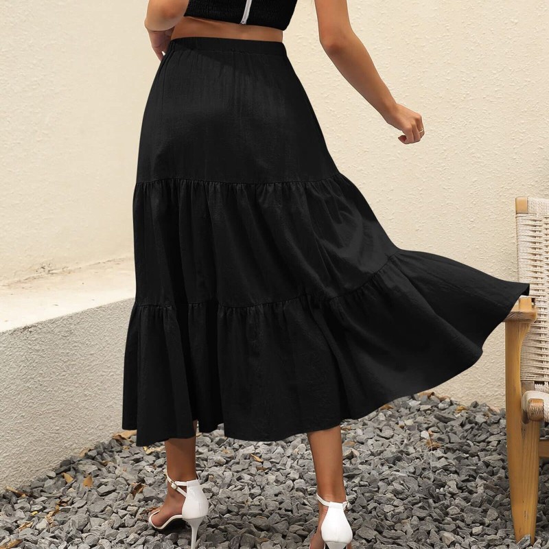 Women Boho Elastic Waist Pleated A-Line Flowy Swing Tiered Long Skirt Dress