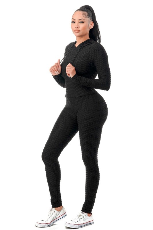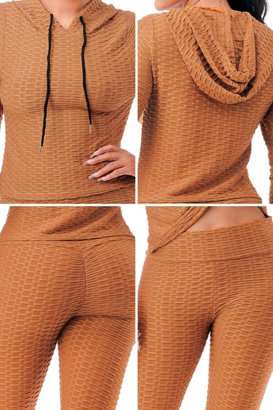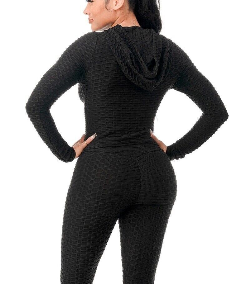 Women Texture 2 Piece Outfit Hoodie Top and Yoga Leggings Pants Workout Set